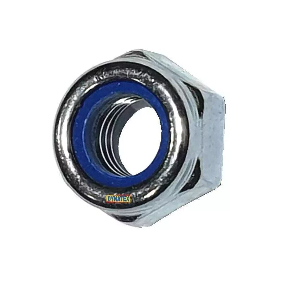Nylon insert nuts made by DYNATEX. These nuts have a one-way drive style and are made of steel and zinc. They are grade 5 and have an open end type. Nyloc nuts are widely used in applications where motion or vibration can cause fasteners to become loose. The nylon insert is situated at the top of the nut and when tightened locks against the thread. Zinc plated metric Nyloc nut DIN 982 p type refers to a specific type of nyloc nut that is commonly used in various industrial applications. These nuts are designed with a zinc-plated surface finish, which provides corrosion resistance and enhances durability